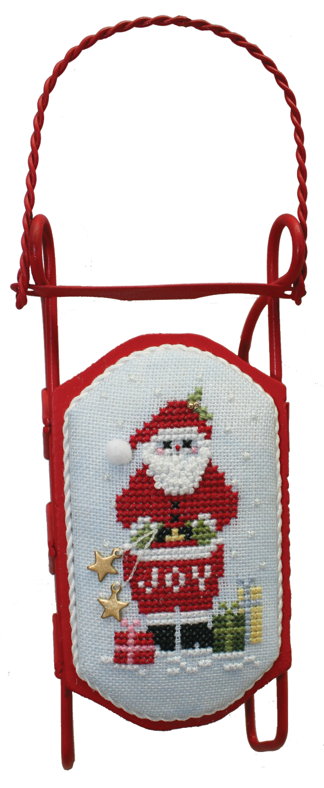 Sledding Santa - The little wooden sleds make such darling ornaments and Christmas decorations - that I couldn't resist designing two more pieces for the sleds. Although I did stitch a second model over one - and finished it as an ornament. The design was stitched on a #32 Vintage Blue Whisper fabric from Zweigart, and measures approximately 1.7" W x 2.9" H - when stitched over two threads. A variety of hand dyed fibers were used in the original, but DMC colors are listed also. Each leaflet includes the embellishments: two brass stars and a pom pom.